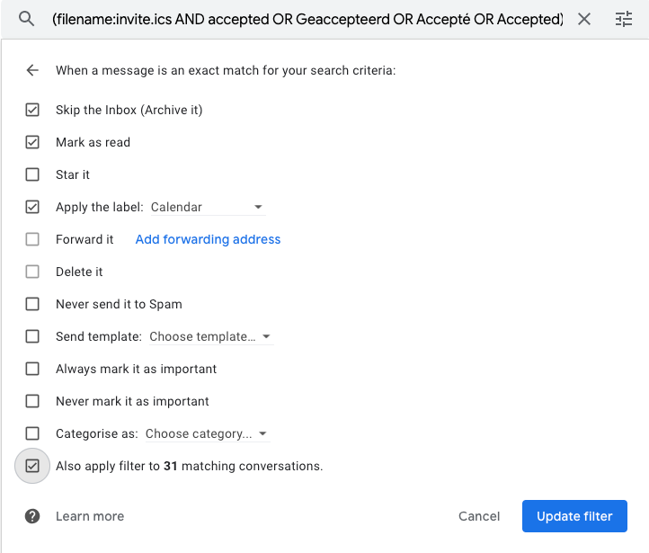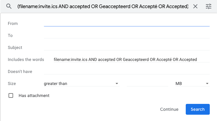 - In the "Includes the words" field, type in "filename:invite.ics AND accepted OR Geaccepteerd OR Accepté OR Accepted",