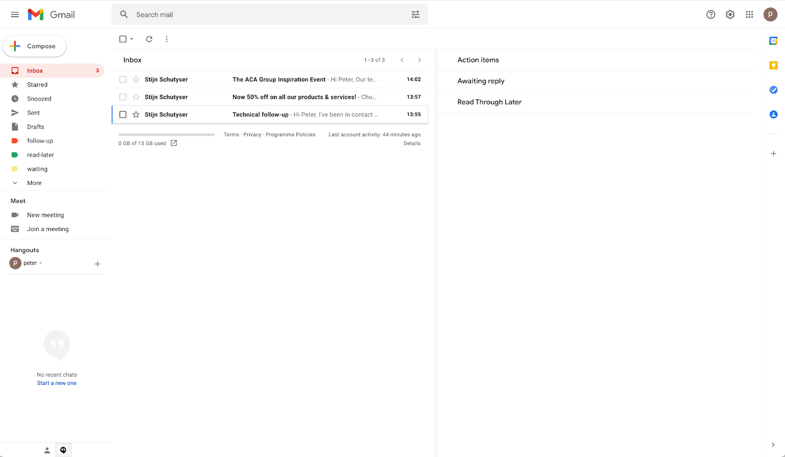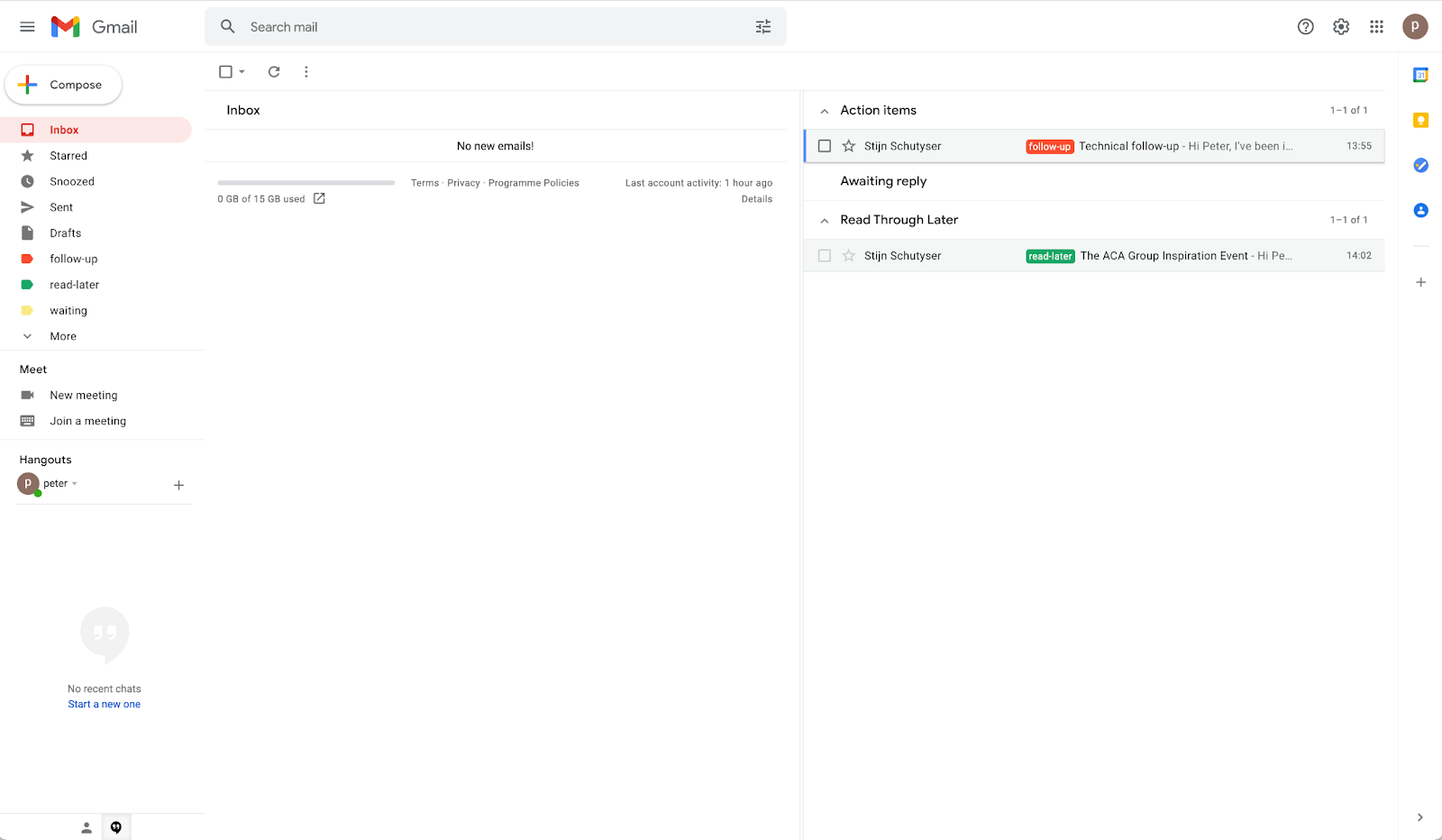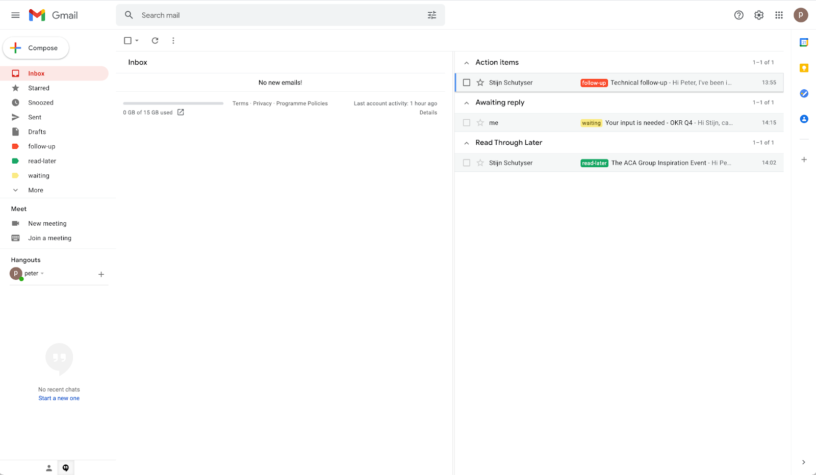 So this is how my inbox looks right now. The main inbox has zero emails, and all your action items and read-through emails have shifted to the right because you applied the labels and archived those emails.