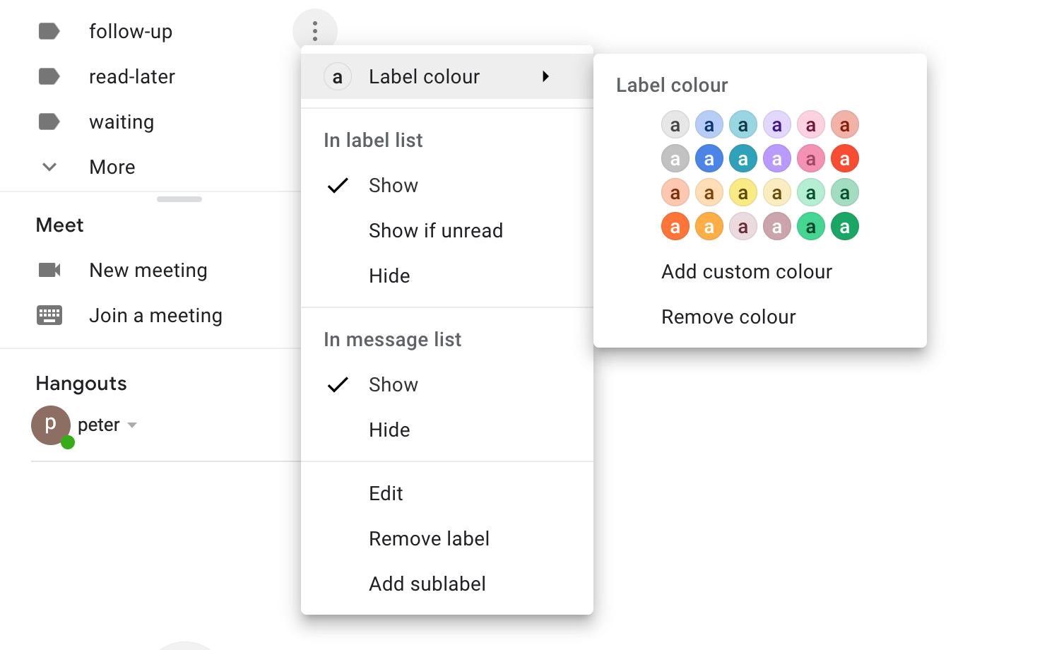 We can make this look a little more visually appealing by applying some color coding. If you click the "follow-up" label, I like to add the red color to this, green for "read later", and yellow for waiting. Of course, you’re free to choose your own colors for labels.