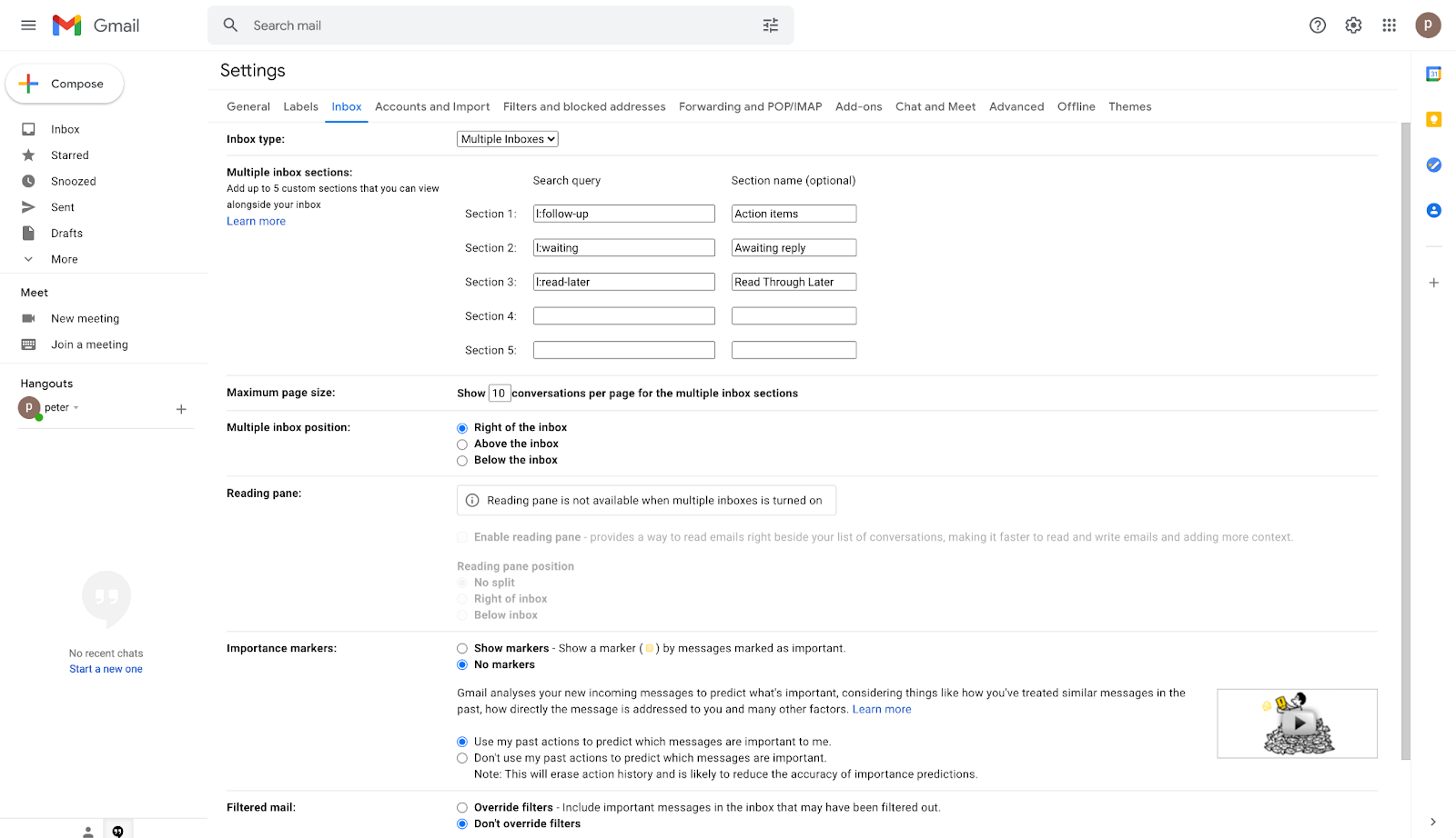 Once you've made those adjustments and saved all your changes, you should be brought back to your main inbox screen. Nothing crazy has happened so far. Three empty sections have popped up on the right-hand side here.